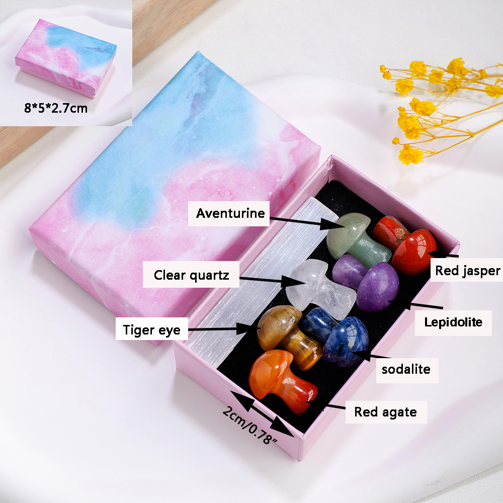 Elevate your spiritual practice and enhance your space with this exquisite 7-piece Chakra Crystal Mushroom Set, complete with a beautiful selenite slab. Each set features seven vibrant gemstones, carefully crafted into charming mushroom shapes, each representing one of the seven chakras. The selenite slab serves as a powerful energy amplifier, making this set perfect for meditation, chakra balancing, energy healing, or simply adding a touch of natural beauty to your home decor.